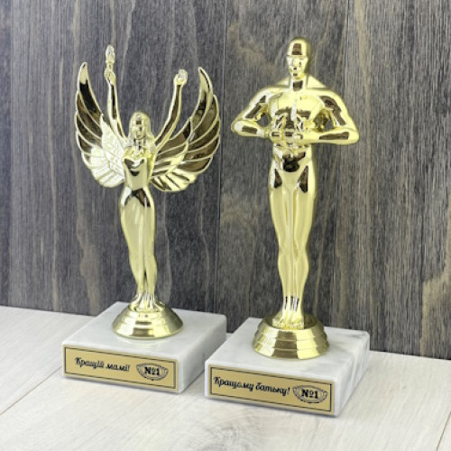 Уявіть собі: як на кінопреміях вручають статуетку "Оскар" за визначні заслуги в кіномистецтві, так і Ви можете вручити нагородну статуетку "Кращим батькам" за безцінний внесок у Ваше життя. Це не просто сувенір - це визнання, оформлене у витончену форму, яка займе почесне місце в будинку і щодня нагадуватиме про Ваше кохання та подяку.